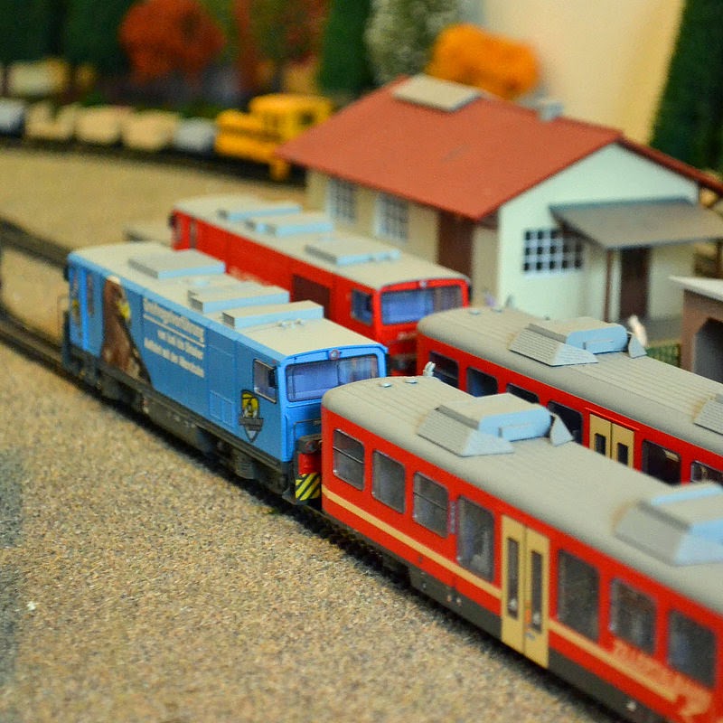 The overhead view is now slightly out of date. I've moved the layout slightly so 2 sides are against walls which means the left hand side of the layout now has a better backdrop of a blank white wall instead of boxes and bags of ballast! I've also begun a bit of a tree avenue in the near left-hand corner of the layout. As its now against the wall its sheltered against accidental knocks so i feel safer putting trees there. The gas station has also been augmented with some painting and some people.